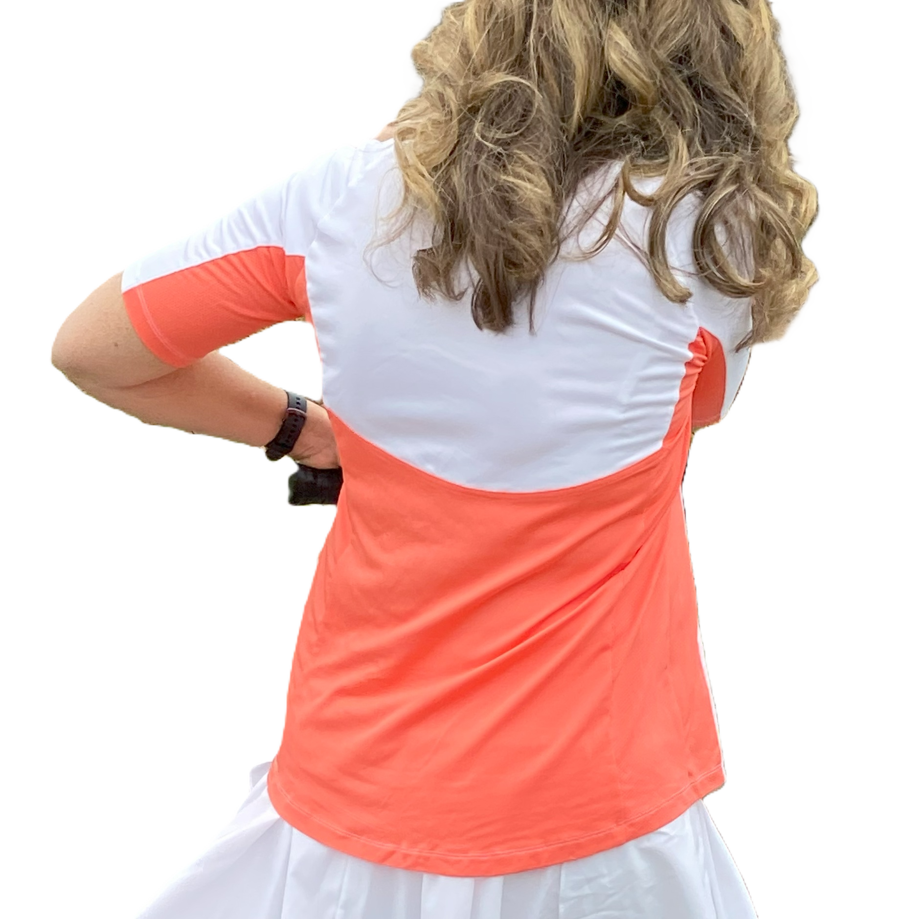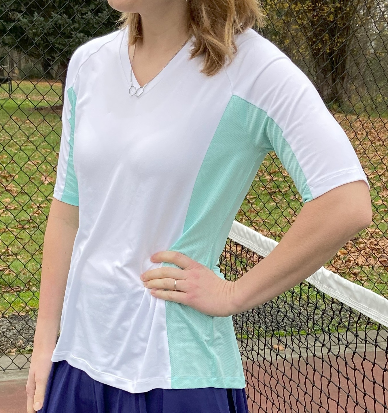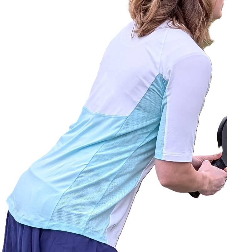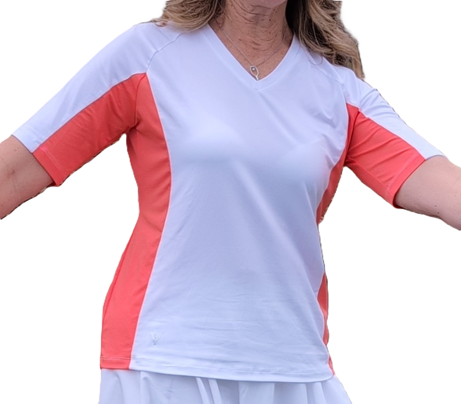 Dominate the court in comfort and style with our women’s pickleball shirt, expertly designed to elevate your performance. The flattering V-neck creates a slimming silhouette, while breathable, non-see-through mesh panels under the arms and along the sides keep you cool and comfortable. But if you do sweat, the moisture wicking and anti-bacterial materials keep you looking and smelling great. Raglan half sleeves offer protection and unrestricted movement, and the eye-catching color blocking design on the back adds fun and a slimming effect. The relaxed fit provides all-day comfort for players of every size, and the slightly longer length ensures confident coverage when reaching for overhead lobs. We took great care in designing this shirt so you can feel comfortable and look great, allowing you to concentrate on the fun you’re having and doing it in style! Shop the collection now and experience the difference!”