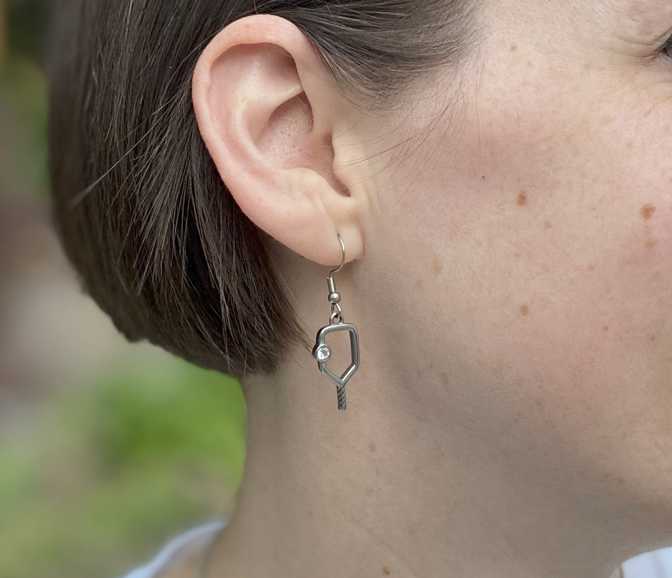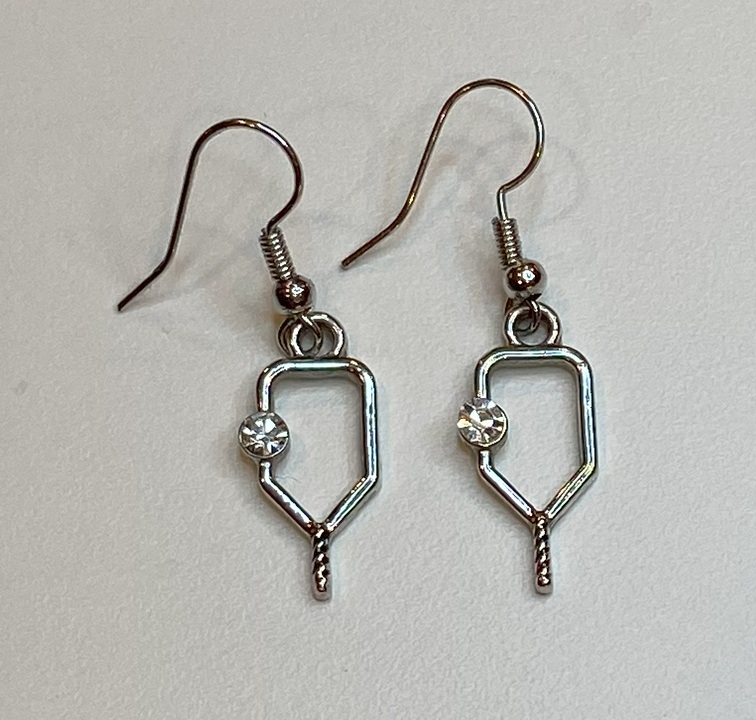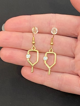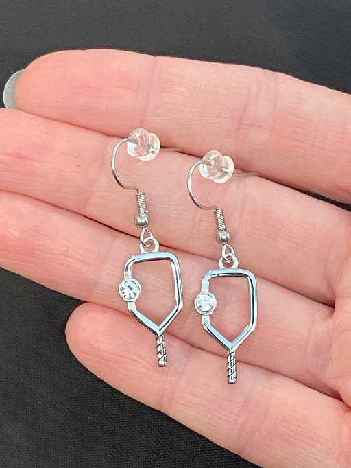 Pickleball Paddle dangle earrings with cubic zirconia gem.