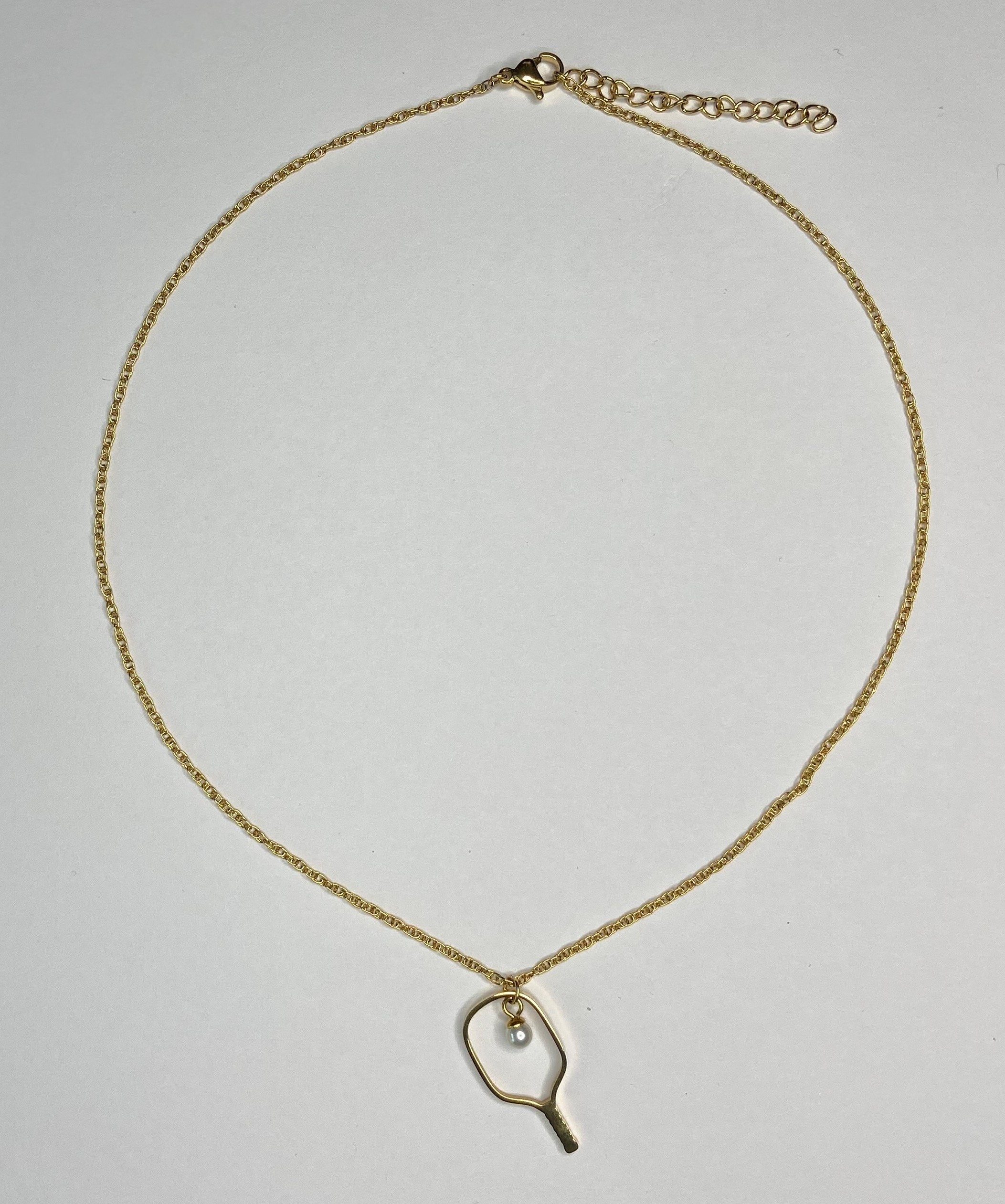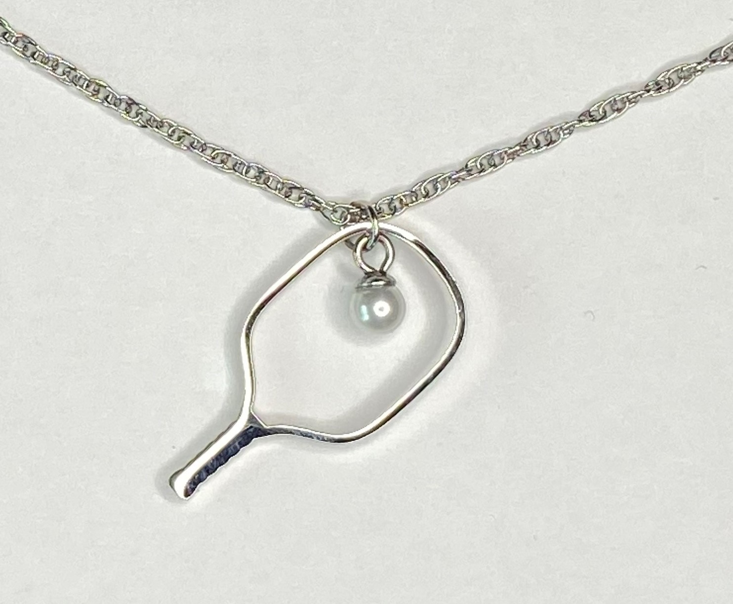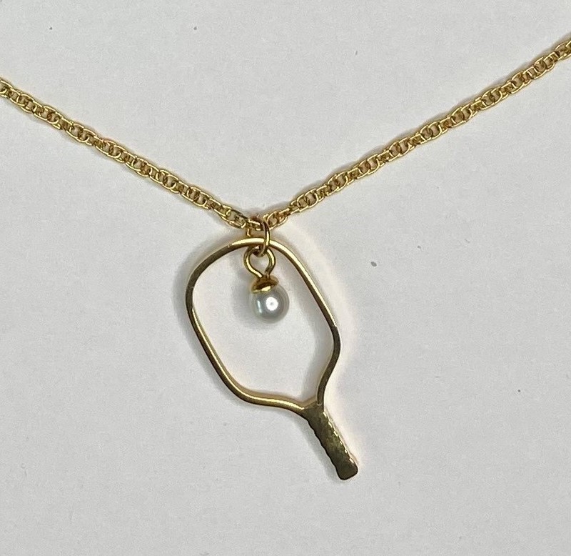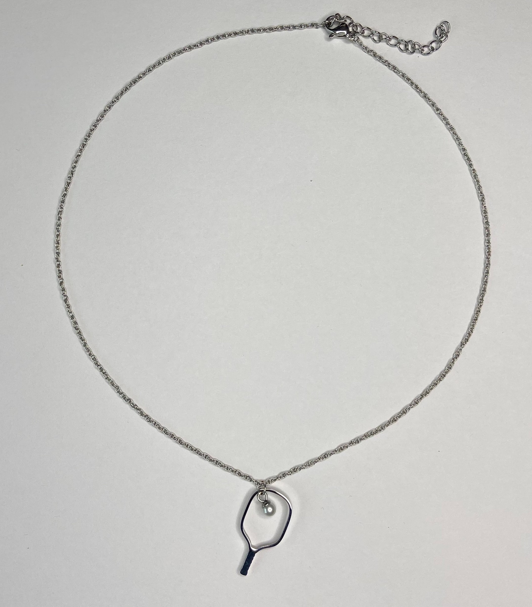 This custom elegant necklace is designed to remind you of the great game you love. Styled with a faux pearl representing the ball in the sweet spot of the paddle. It can be worn on and off the court. The fine detailed chain is 15 inches with a 2-inch extender to adjust to your liking. It is beautiful and durable.