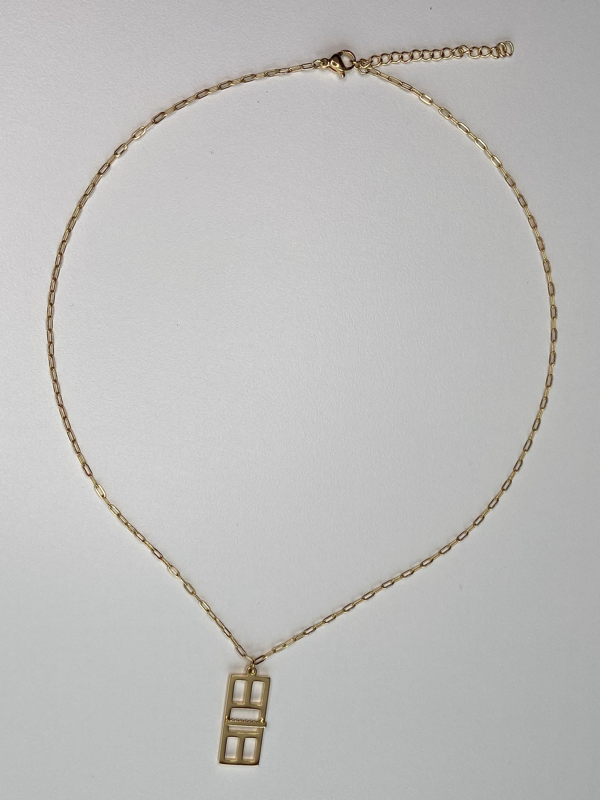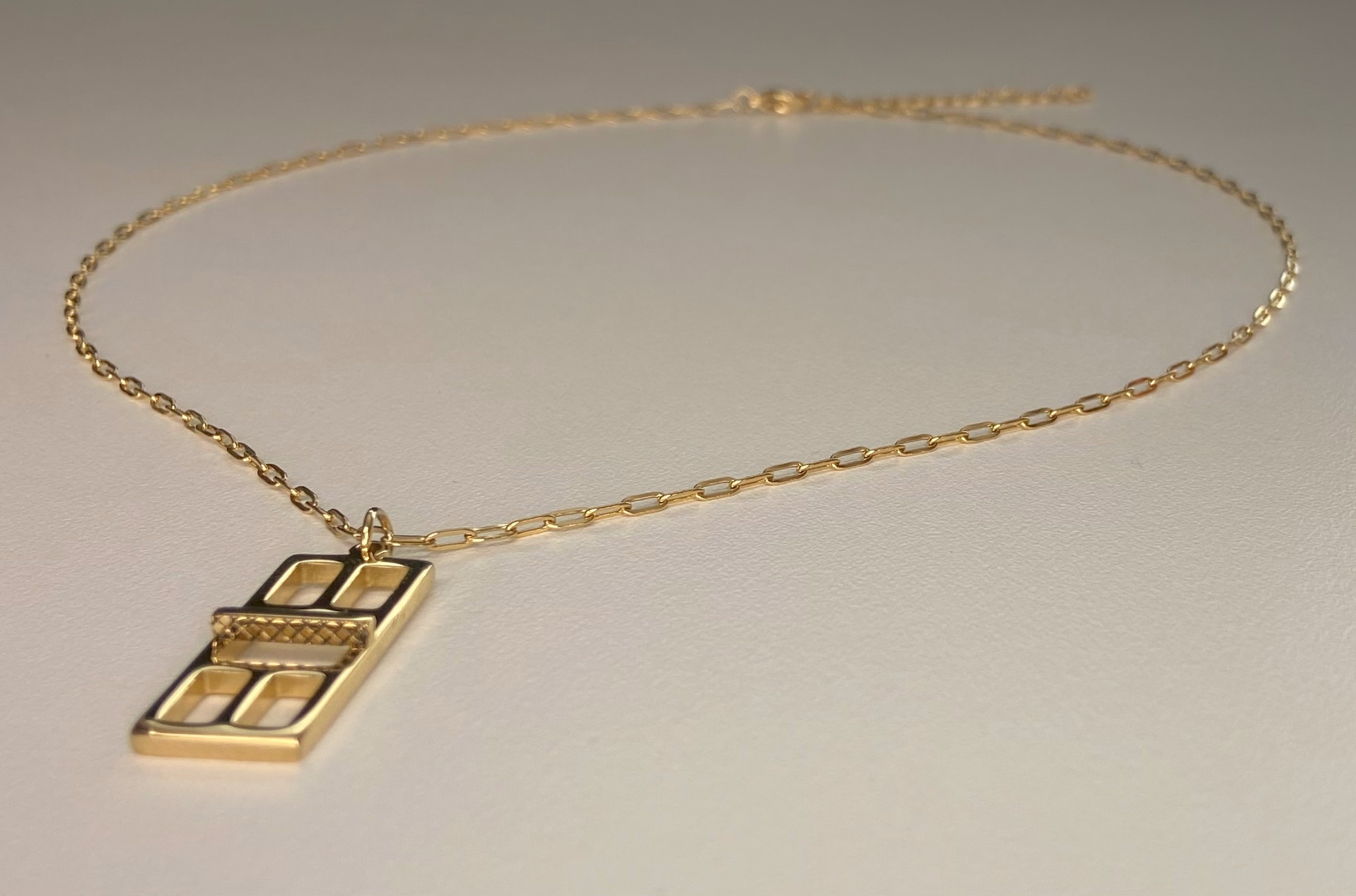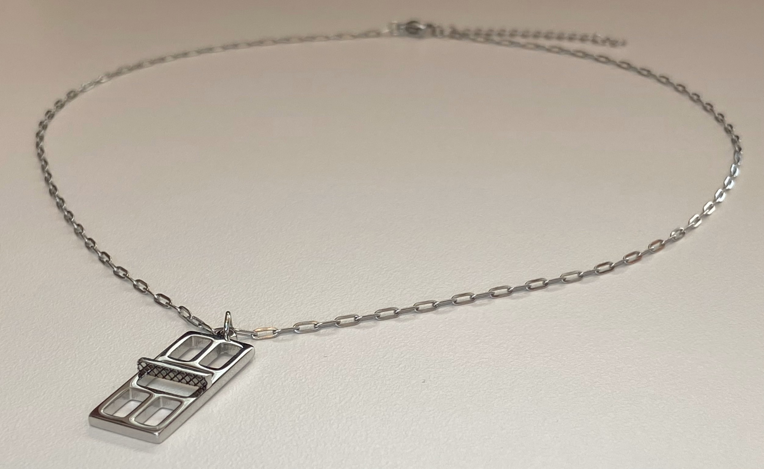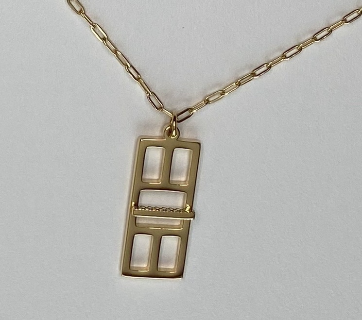 This necklace is designed from the regulation dimensions of the court playing areas and scaled to depict the Pickleball Court. In order to add depth to the piece we raised the net from the playing field and added texture to both sides to give it that extra detail. The pendant is being paired with a wonderful “paper clip” chain. The chain is proportioned to be noticed but not overpower the statement of the pendant.